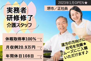 ≪堺市/実務者研修修了/正社員≫2023年1月OPEN◆日曜休み◆月収例23.0万円◆年間休日108日◆退職金制度あり◆デイサービスでのお仕事です☆(osa)