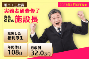 ≪堺市/施設長(実務者研修修了)/正社員≫2023年1月OPEN◆社食あり◆月収例32.0万円◆年間休日108日◆退職金制度あり◆デイサービスでのお仕事です☆(osa)