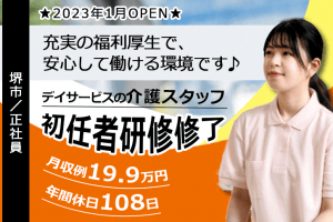 ≪堺市/初任者研修修了/正社員≫日曜休み◆月収例22.3万円◆実質無料で資格取得◆年間休日108日◆デイサービスでのお仕事です☆(osa)