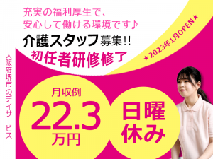 ≪堺市/初任者研修修了/正社員≫日曜休み◆月収例22.3万円◆実質無料で資格取得◆年間休日108日◆デイサービスでのお仕事です☆(osa)