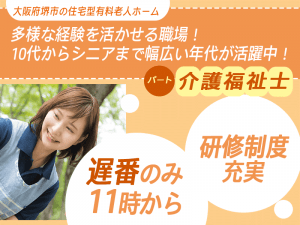 ≪堺市/介護福祉士/遅番パート≫★遅番のみ11時~◆研修制度充実◆通勤手当上限なし◆昇給年1回20円UP◆夜勤なし◆勤務日数相談可★住宅型有料老人ホームでのお仕事です☆