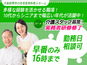 ≪堺市/実務者研修修了/早番パート≫★勤務日相談可♪早番のみ☆日祝出勤手当100円UP☆昇給年1回20円UP☆交通費上限なし★住宅型有料老人ホームでのお仕事です☆
