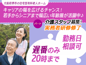 ≪堺市/実務者研修修了/遅番パート≫★勤務日相談可♪遅番のみ20時迄☆日祝出勤手当100円UP☆昇給年1回20円UP☆交通費上限なし★住宅型有料老人ホームでのお仕事です☆