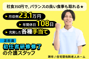 ≪堺市/初任者研修修了/正社員≫月収例25.5万円◆実質無料で資格取得◆年間休日108日◆住宅型有料老人ホームでのお仕事です☆(kyo)