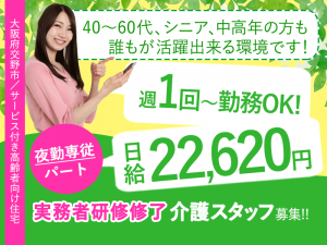 ≪交野市/介護福祉士/パート≫夜勤専従◆日給22,620円◆週1回からOK◆サ高住でのお仕事です☆(osa)