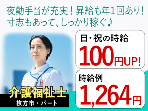 ≪枚方市/介護福祉士/フルタイムパート≫★日祝の時給100円UP◎夜勤手当充実◎時給例1,380円◎昇給年1回あり◎寸志あり◎希望休制度★住宅型有料老人ホーム でのお仕事です☆