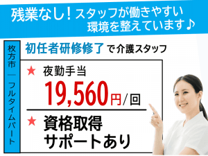 ≪枚方市/初任者研修修了/フルタイムパート≫★資格取得サポートあり◎交通費実費◎残業なし◇日祝の時給100円UP◇社内研修制度★住宅型有料老人ホーム でのお仕事です☆