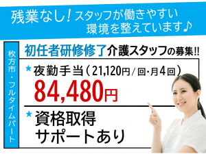 ≪枚方市/初任者研修修了/フルタイムパート≫★資格取得サポートあり◎交通費実費◎残業なし◇日祝の時給100円UP◇社内研修制度★住宅型有料老人ホーム でのお仕事です☆