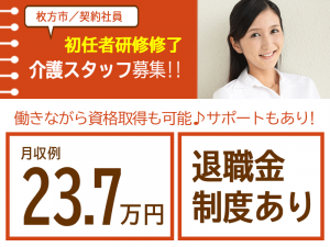 ≪枚方市/初任者研修修了/契約社員≫月収例25.5万円◆実質無料で資格取得◆年間休日108日◆住宅型有料老人ホームでのお仕事です☆(osa)