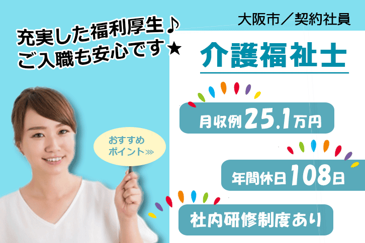 ≪大阪市/介護福祉士/契約社員≫◆駅徒歩3分◎月収例27.2万円◎残業ほぼ無し◎賞与2.0ヶ月分◎6カ月後に正社員登用前提★サービス付き高齢者住宅でのお仕事です☆(osa)