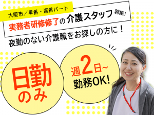 ≪大阪市/実務者研修修了/早番・遅番パート≫◆週2日からOK☆昇給年1回☆時給例1,330円◎駅チカ3分☆資格取得支援あり☆寸志あり◆サービス付き高齢者向け住宅でのお仕事です☆