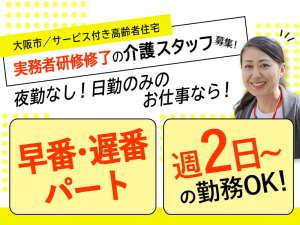 ≪大阪市/実務者研修修了/早番・遅番パート≫◆週2日からOK☆昇給年1回☆時給例1,330円◎駅チカ3分☆資格取得支援あり☆寸志あり◆サービス付き高齢者向け住宅でのお仕事です☆