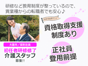 ≪大阪市/初任者研修修了/契約社員≫◆6カ月後に正社員登用前提◎資格取得支援制度◎月収例25.5万円◎駅徒歩3分◎賞与2.0ヶ月分★サービス付き高齢者住宅でのお仕事です☆(osa)
