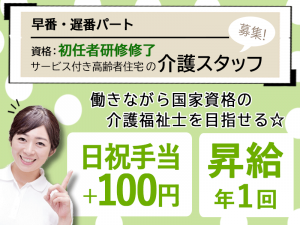 ≪大阪市/初任者研修修了/早番・遅番パート≫◆日祝手当+100円♪昇給年1回♪時給例1,280円♪寸志あり♪資格取得支援あり♪楽らく駅徒歩3分◆サービス付き高齢者向け住宅でのお仕事です☆