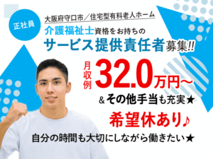 ≪守口市/サービス提供責任者(介護福祉士)/正社員≫★高収入スタートでキャリアに自信!管理職の月収例32.0万円~◎その他手当も充実☆希望休あり★住宅型有料老人ホームでのお仕事です☆(osa)