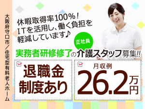 ≪守口市/実務者研修修了/正社員≫月収例26.2万円◆年間休日108日◆退職金制度あり◆住宅型有料老人ホームでのお仕事です☆(kyo)