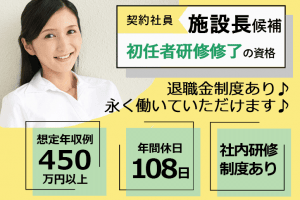 ≪守口市/施設長(初任者研修修了)/契約社員≫◆月収例35.2万円◆社内研修制度◆年間休日108日◆退職金制度あり◆住宅型有料老人ホームでのお仕事です☆(osa)