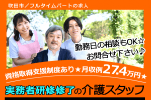 ≪吹田市/実務者研修修了/フルタイムパート≫★時給例1,330円☆資格取得支援制度☆勤務日相談可★住宅型有料老人ホームでのお仕事です☆