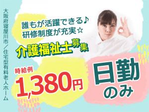 医療・介護キャリアサーチ奈良/大阪TOP › ≪寝屋川市/介護福祉士/パート≫★時給例1,380円◎夜勤なし◎賞与あり★住宅型有料老人ホームでのお仕事です☆ › 543-e11-pcw 株式会社ライフケア・ビジョン 住宅型有料老人ホーム はっぴーらいふ寝屋川