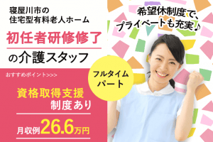 ≪寝屋川市/初任者研修修了/フルタイムパート≫★時給例1,280円☆資格取得支援制度☆希望休制度★住宅型有料老人ホームでのお仕事です☆