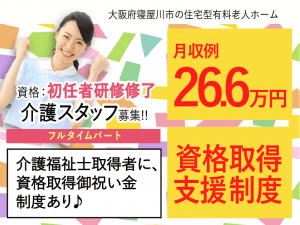 ≪寝屋川市/初任者研修修了/フルタイムパート≫★時給例1,280円☆資格取得支援制度☆希望休制度★住宅型有料老人ホームでのお仕事です☆