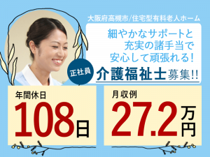 ≪高槻市/介護福祉士/正社員≫◆月収例27.2万円◇年間休日108日◇賞与あり◆住宅型老人ホームでのお仕事です☆(osa)