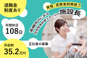≪高槻市/施設長(実務者研修修了)/正社員≫★年間休日108日◎月収例34万円◎退職金制度◎★住宅型老人ホームでのお仕事です☆(osa)
