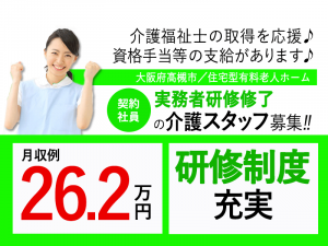≪高槻市/実務者研修修了/契約社員≫★月収例26.2万円◎研修制度充実◎年間休日108日★住宅型有料老人ホームでのお仕事です☆(osa)