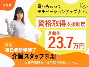 ≪高槻市/初任者研修修了/正社員≫◆月収例25.5万円◎資格取得支援制度◎賞与あり◆住宅型老人ホームでのお仕事です☆(osa)
