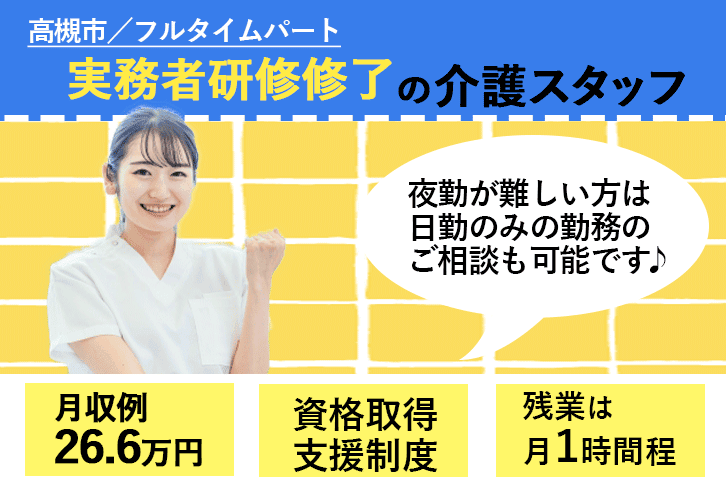 ≪高槻市/初任者研修修了/フルタイムパート≫★時給例1,280円◎資格取得支援制度◎年間休日108日★住宅型有料老人ホームでのお仕事です☆