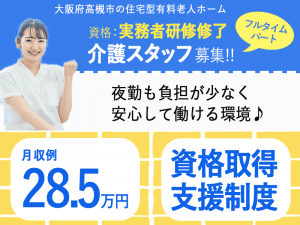 ≪高槻市/初任者研修修了/フルタイムパート≫★時給例1,280円◎資格取得支援制度◎年間休日108日★住宅型有料老人ホームでのお仕事です☆