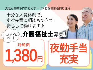 ≪高槻市/介護福祉士/フルタイムパート≫★時給例1,380円◎夜勤手当充実◎希望休制度★サービス付き高齢者向け住宅でのお仕事です☆