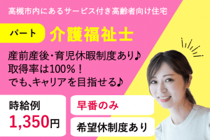 ≪高槻市/介護福祉士/早番のみパート≫★早番のみ◎時給例1,380円◎希望休制度★サービス付き高齢者向け住宅でのお仕事です☆