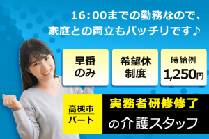 ≪高槻市/実務者研修修了/早番のみパート≫★希望休制度◎16時まで勤務◎時給例1,330円★サービス付き高齢者向け住宅でのお仕事です☆