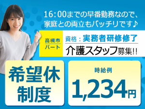 ≪高槻市/実務者研修修了/早番のみパート≫★希望休制度◎16時まで勤務◎時給例1,330円★サービス付き高齢者向け住宅でのお仕事です☆