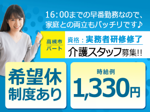 ≪高槻市/実務者研修修了/早番のみパート≫★希望休制度◎16時まで勤務◎時給例1,330円★サービス付き高齢者向け住宅でのお仕事です☆