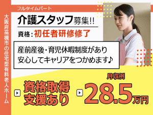 ≪高槻市/初任者研修修了/フルタイムパート≫★時給例1,280円~♪資格取得支援あり♪研修制度充実♪昇給あり★住宅型有料老人ホームでのお仕事です☆