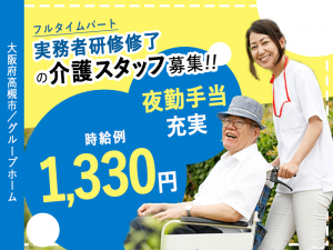 ≪高槻市/実務者研修修了/フルタイムパート≫★☆夜勤手当充実◎時給例1,330円◎資格取得支援あり☆★グループホームでのお仕事です☆