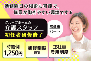 ≪高槻市/初任者研修修了/パート≫★勤務曜日時間相談可◎異業種からの転職でも安心◎時給例1,280円★グループホームでのお仕事です☆(osa)