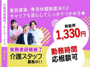 ≪高槻市/実務者研修修了/パート≫★勤務時間応相談可◎時給例1,330円◎日勤のみ★デイサービスでのお仕事です☆