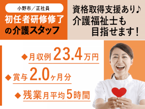 ≪小野市/初任者研修修了/正社員≫★月収例25.5万円♪残業月平均5時間♪賞与2.0ヶ月分◎マイカー通勤相談OK♪資格取得支援あり★介護付有料老人ホームでのお仕事です☆
