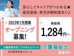 ≪茨木市/介護福祉士/フルタイムパート≫★2023年7月開業◇時給例1,380円~◇年間休日108日★住宅型有料老人ホームでのお仕事です☆