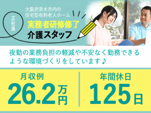 ≪茨木市/実務者研修修了/正社員≫◆年間休日125日◎2023年7月開業◎月収例26.2万円◆住宅型有料老人ホームでのお仕事です☆(osa)