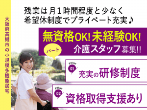医療・介護キャリアサーチ奈良/大阪TOP › ≪高槻市/無資格・未経験可の介護士/パート≫◆資格取得支援◎研修制度充実◎時給例1,280円~◆小規模多機能居宅でのお仕事です☆(osa)