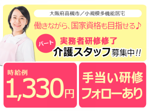 ≪高槻市/実務者研修修了/パート≫◆時給例1,330円◎研修制度充実◆小規模多機能居宅でのお仕事です☆(osa)