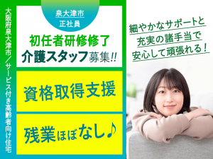 ≪泉大津市/初任者研修修了/正社員≫◆資格取得支援制度!研修制度が充実でスキルアップ可能♪残業ほぼなし♪6年間に渡り毎年5000円昇給◆サービス付き高齢者向け住宅でのお仕事です☆(osa)
