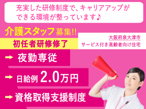 ≪泉大津市/初任者研修修了/パート(夜勤専従)≫★資格取得支援制度◎日給例2.1万円◎未経験OK◎研修制度充実★サービス付き高齢者向け住宅でのお仕事です☆