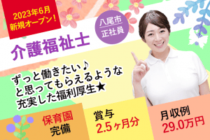 ≪八尾市/介護福祉士/正社員≫2023年オープン!月収例29.0万円◎保育園完備♪年間休日107日!賞与2.5ヶ月分◎医療特化型老人ホームで介護のお仕事です☆(osa)
