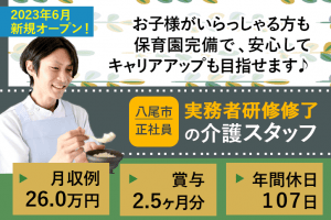 ≪八尾市/実務者研修修了/正社員≫年間休日107日!2023年オープン!月収例26.0万円◎保育園完備♪嬉しい福利厚生が充実★賞与2.5ヶ月分◎医療特化型老人ホームで介護のお仕事です☆(osa)