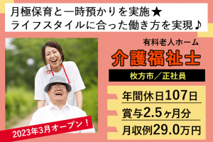 ≪枚方市/介護福祉士/正社員≫2023年3月オープン!月収例29.0万円◎保育園完備♪年間休日107日!賞与2.5ヶ月分◎住宅型有料老人ホームで介護のお仕事です☆(osa)